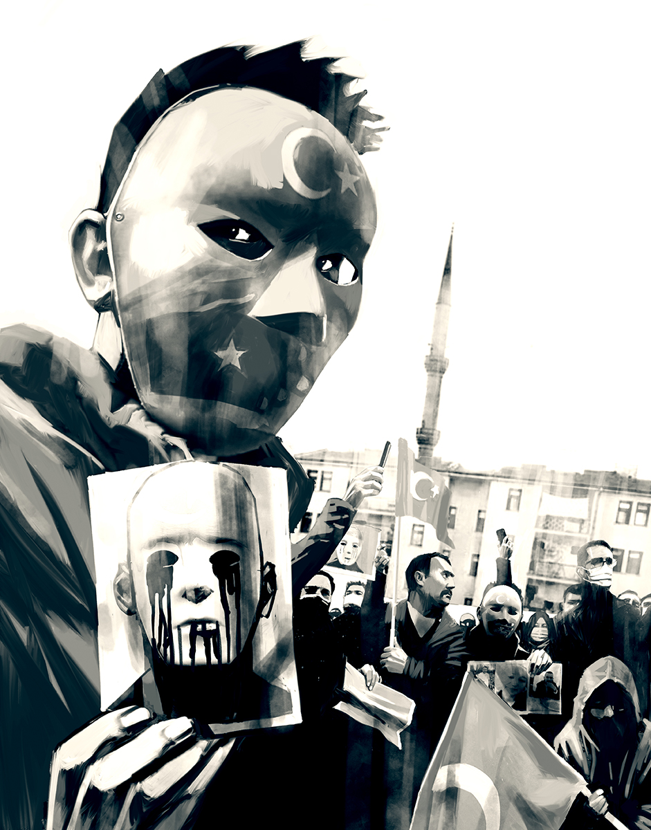 Illustrations for April’s issue of Harper’s Magazine’s article Spies Next Door by John Beck, about China’s intimidation campaign against Uighur exiles.